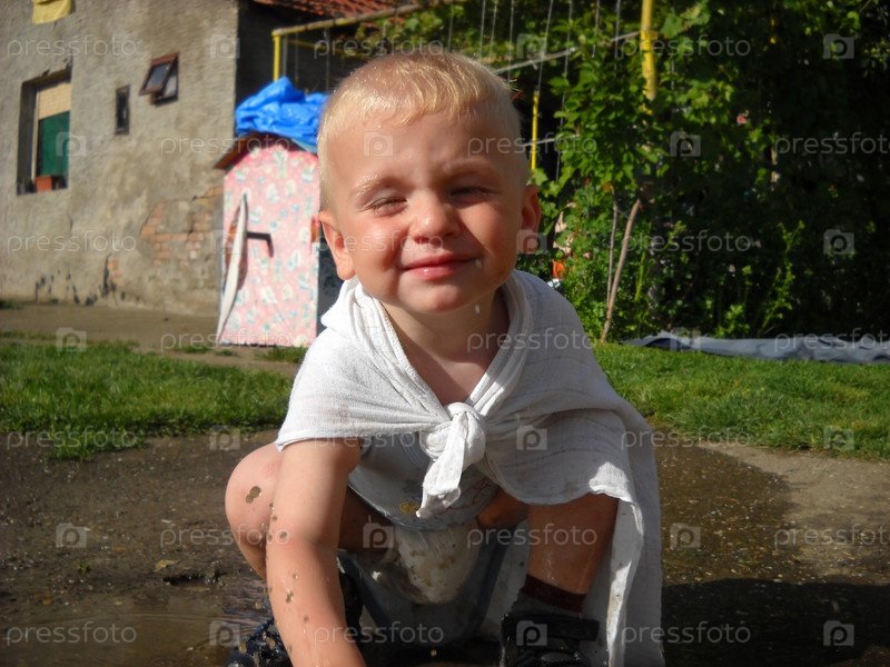 Мальчик играет в грязной луже и брызгает вокруг себя водой. Мальчик в подгузнике стоит в туфлях в воде. На спину мальчика накинута белая тряпка от загара