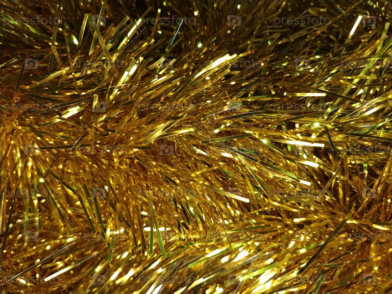 Крупным планом елочная мишура. Золотая фольга. Украшение к новогодним праздникам. Блеск и сияние. Блик на желтой рождественской мишуре