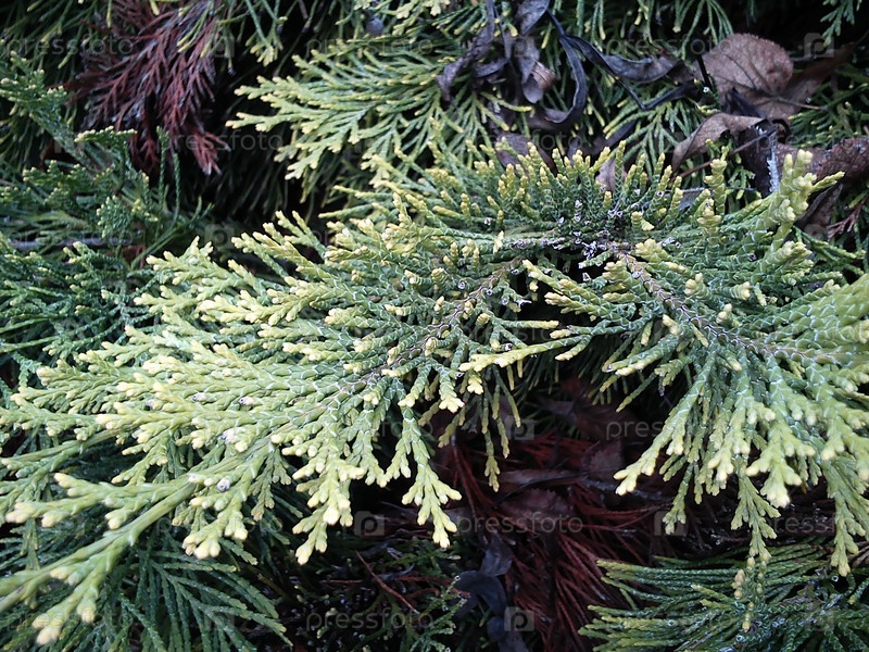 Зеленые ветки и листья туи. Тую используют для озеленения городов, для ландшафтного дизайна. Неприхотливое, морозостойкое, вечнозеленое растение. Крупный план. Осенняя пора