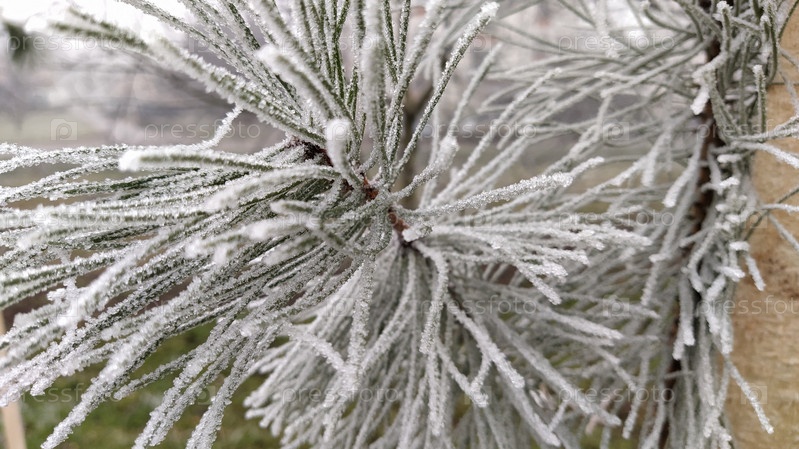 Красивые длинные сосновые иголки с белым инеем. Замороженные ветки вечнозеленого растения. Деревья замерзли в страшный мороз. Кристаллы льда образовались из-за высокой влажности
