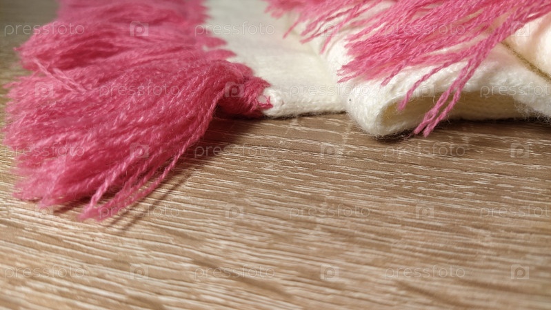 Шарф выполнен из белых и розово-белых ниток. Вязание на деревянном столе. Пустое место для текста. Мягкие пастельные тона. Зимняя одежда