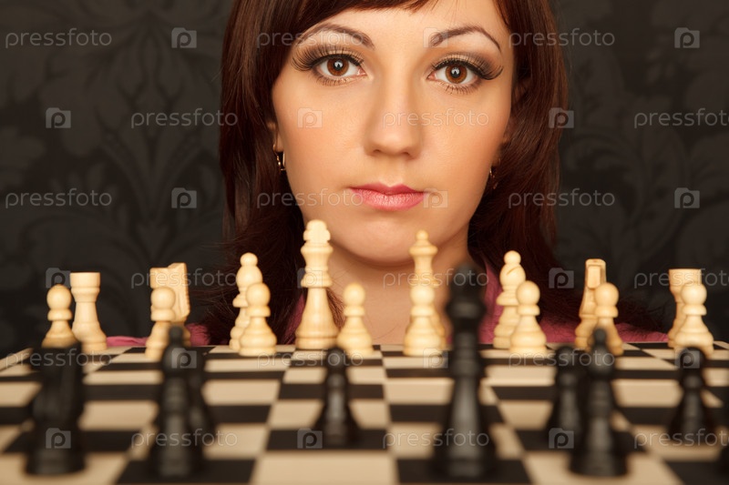 Портрет девушки в красной рубашке, с шахматной доской. Горизонтальный формат. Крупный план