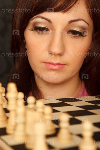 Портрет девушки в красной рубашке, с шахматной доской. Вертикальный формат. Крупный план