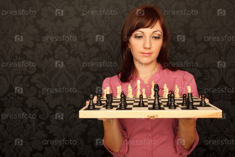 Портрет девушки в красной рубашке, с шахматной доской. Горизонтальный формат. Крупный план