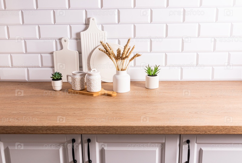 Красивый кухонный фон с различными предметами и кухонной утварью из экологически чистых материалов. деревянная столешница, стена из белого кирпича