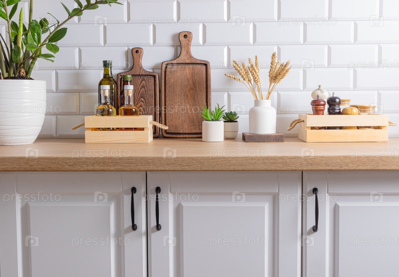 Вид спереди на кухонную деревянную столешницу с местом для хранения масла и различных специй в деревянных ящиках. зеленые растения в горшках. Компактное хранение