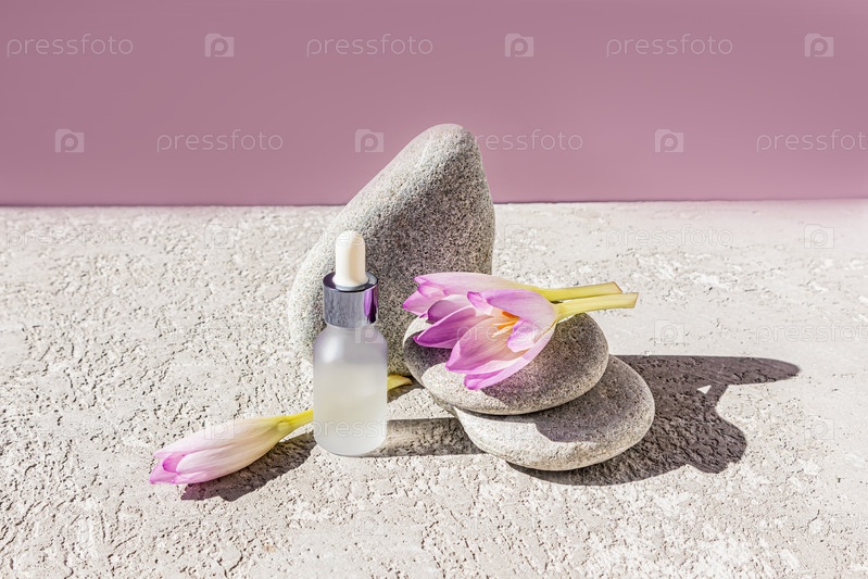 Белый матовый флакон с пипеткой с натуральным косметическим продуктом на серых овальных камнях и цветах крокуса. Пустой макет для бренда. упаковка