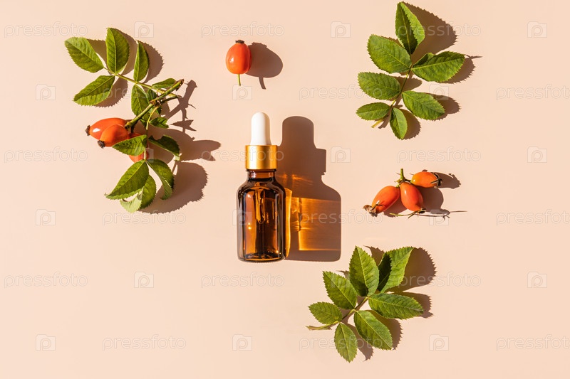 Косметический флакон с пипеткой с натуральным средством или сывороткой на основе масла шиповника для ухода за кожей лица и волосами. Органический уход