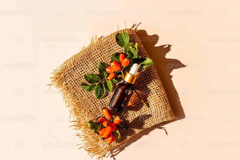 Косметическая бутылочка с белой крышкой с капельницей с натуральным средством на основе масла семян шиповника лежит на мешковине среди ягод