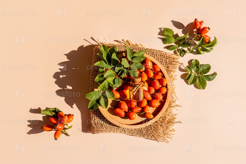 Вид сверху на стеклянную бутылку с крышкой органического масла семян шиповника на круглом деревянном подносе с ягодами. естественный уход. Альтернатива медицине