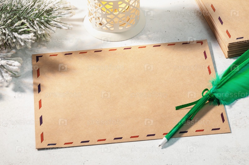 Письмо Санта-Клаусу на столе с местом для копирования, шаблон для дизайнера, пустой конверт