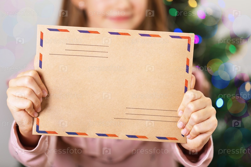 Ребенок держит перед собой в руках пустой почтовый конверт, концепцию письма от Санта-Клауса, шаблон для дизайнера