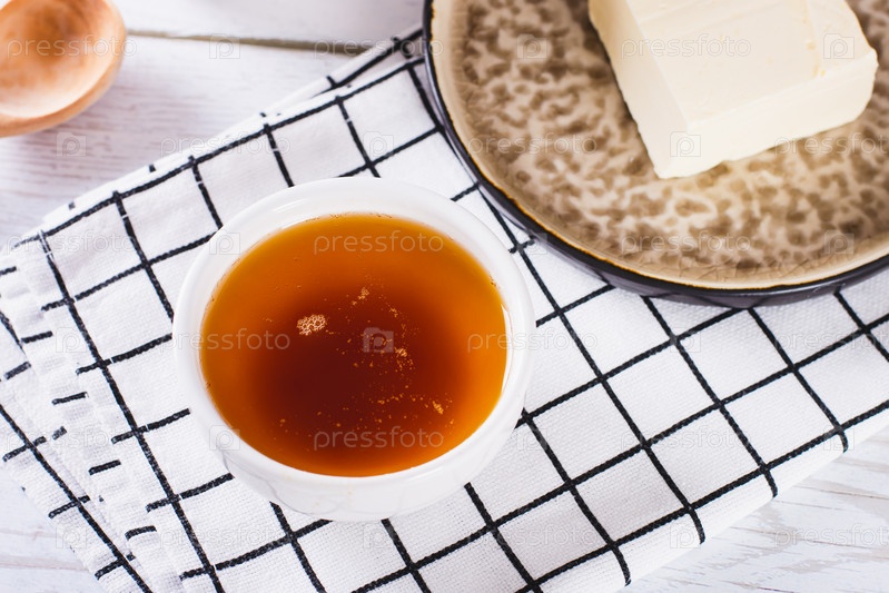 Вкусный соус из растопленного коричневого масла в миске на столе