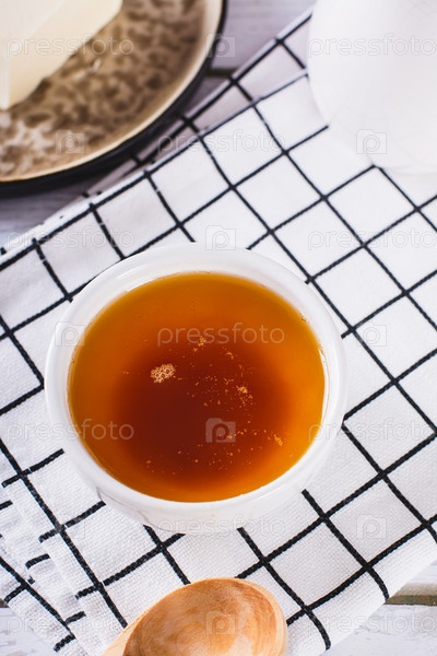 Вкусный соус из расплавленного коричневого масла в миске на столе, вертикальный вид