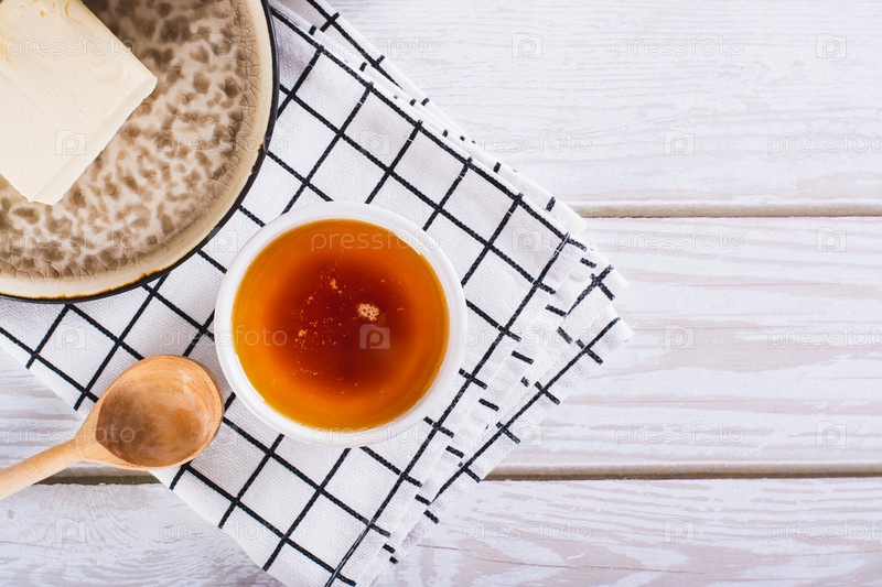 Ароматное топленое коричневое масло для соуса в миске на столе, вид