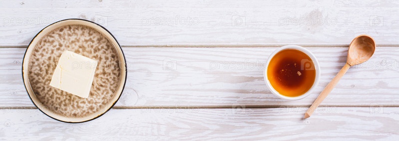 Вкусный соус из расплавленного коричневого масла в миске на столе, вид веб-баннера