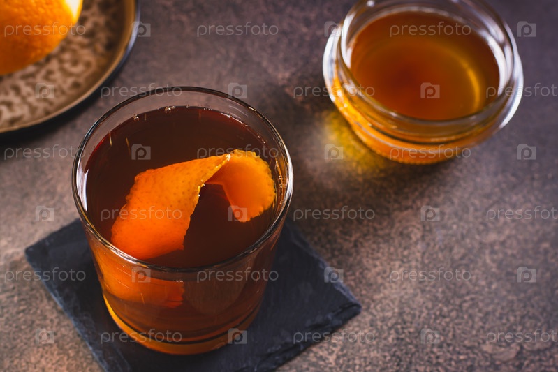 Коктейль из виски с коричневым маслом и апельсиновая цедра в стакане на столе