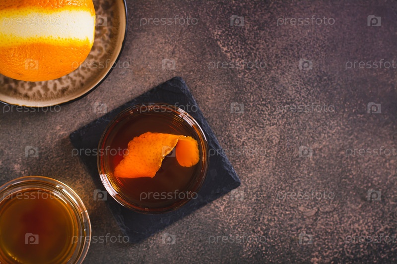 Крепкий алкогольный коктейль из коричневого масла с апельсиновой цедрой в стеклянном виде сверху