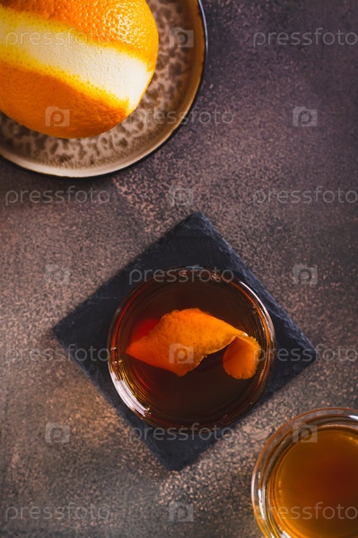 Коктейль из виски с коричневым маслом и апельсиновой цедрой в стакане на столе и вертикальный вид