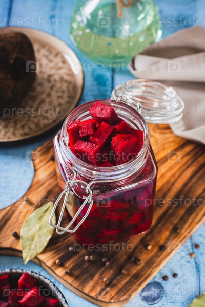 Вкусная маринованная свекла с душистым перцем и лавровым листом в банке на столе, вертикальный вид