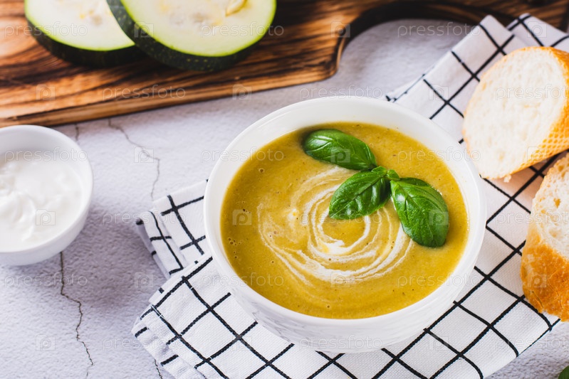 Вкусный суп-пюре из цуккини в миске и кусочки хлеба на столе