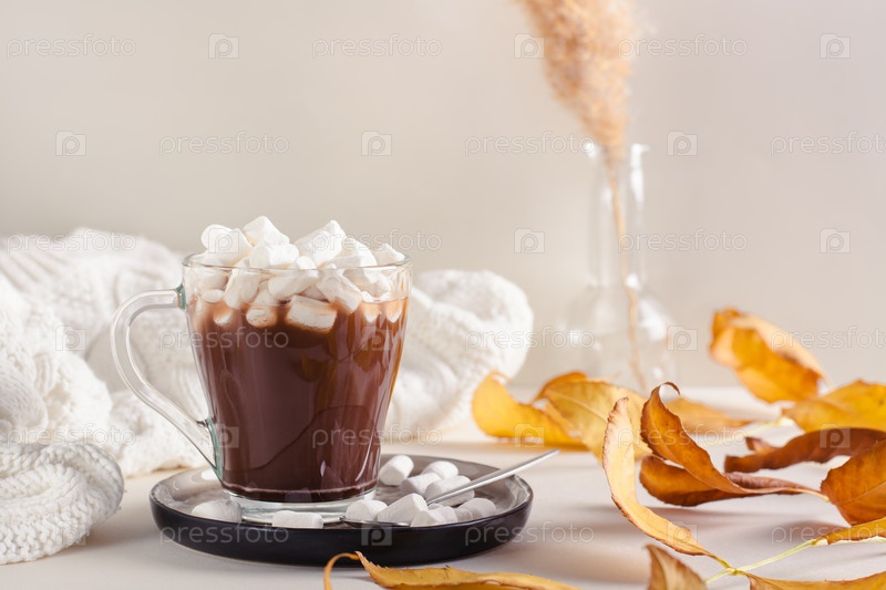 Горячий шоколад с зефиром в чашке на столе среди осенних листьев