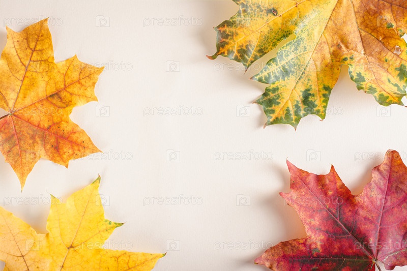 Красивый фон из разноцветных кленовых листьев на бежевом виде сверху