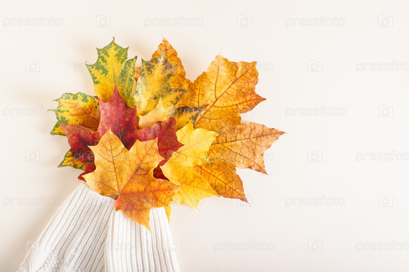 Букет разноцветных кленовых листьев в рукавах белого вязаного свитера, вид сверху