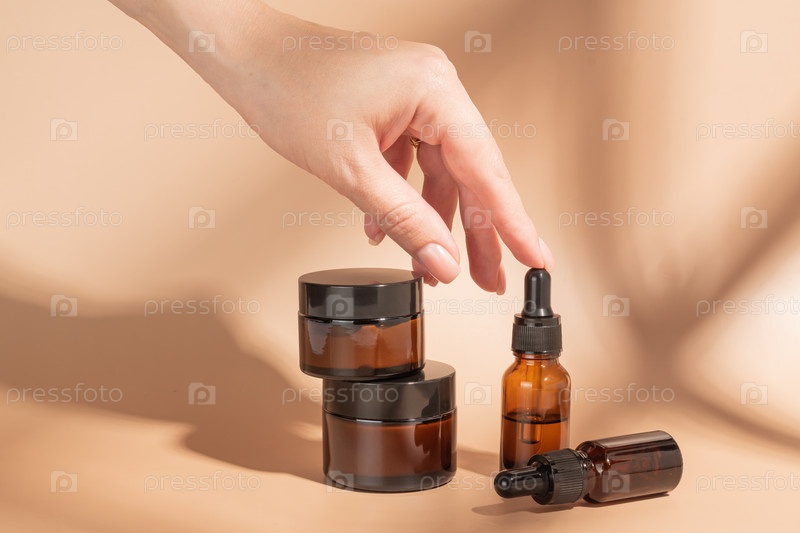 Женская рука берет бутылку янтарного стекла с косметической сывороткой на бежевом фоне. Макет контейнеров с крышкой-капельницей с коллагеном. Концепция ухода за кожей