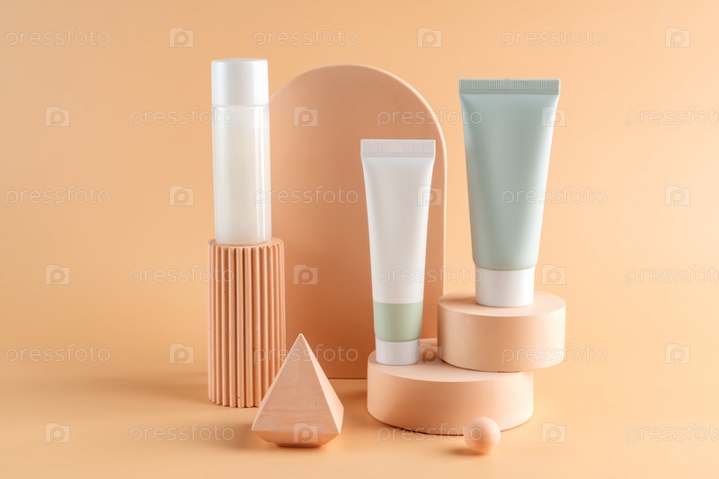 Красивые косметические шаблоны для рекламы, пластиковые тюбики и флаконы с кремом на светло-бежевом фоне с подиумами. Бьюти-дизайн для продукта премиум-класса