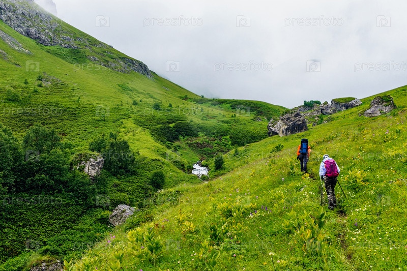 Туристы с рюкзаками путешествуют по горам Кавказа