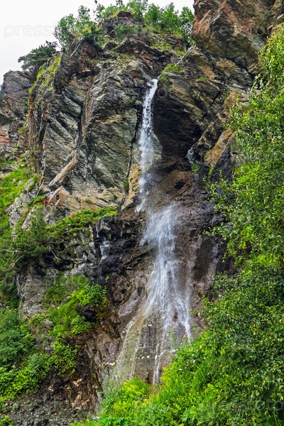 Водопад стекает с крутой скалы в горах