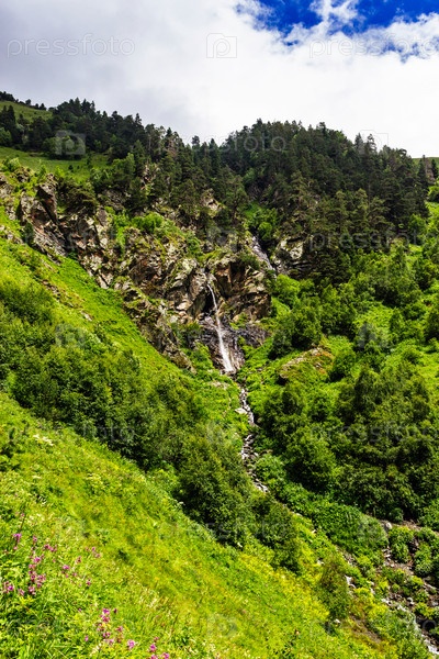 Водопад стекает с крутой скалы в горах