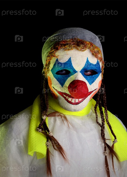 Девушка в маске страшного клоуна на черном фоне. Концепция страха. Праздник Хэллоуин