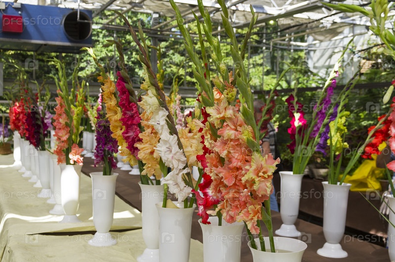 Букеты из красивых разноцветных гладиолусов. Выставка гладиолусов в оранжерее Аптекарского Огорода (филиал ботанического сада МГУ). Москва