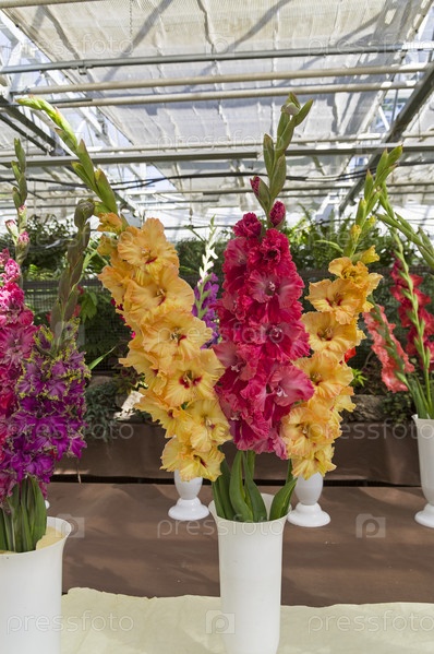 Букеты из красивых разноцветных гладиолусов. Выставка гладиолусов в оранжерее Аптекарского Огорода (филиал ботанического сада МГУ). Москва
