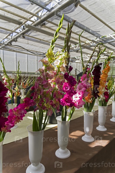 Букеты из красивых разноцветных гладиолусов. Выставка гладиолусов в оранжерее Аптекарского Огорода (филиал ботанического сада МГУ). Москва