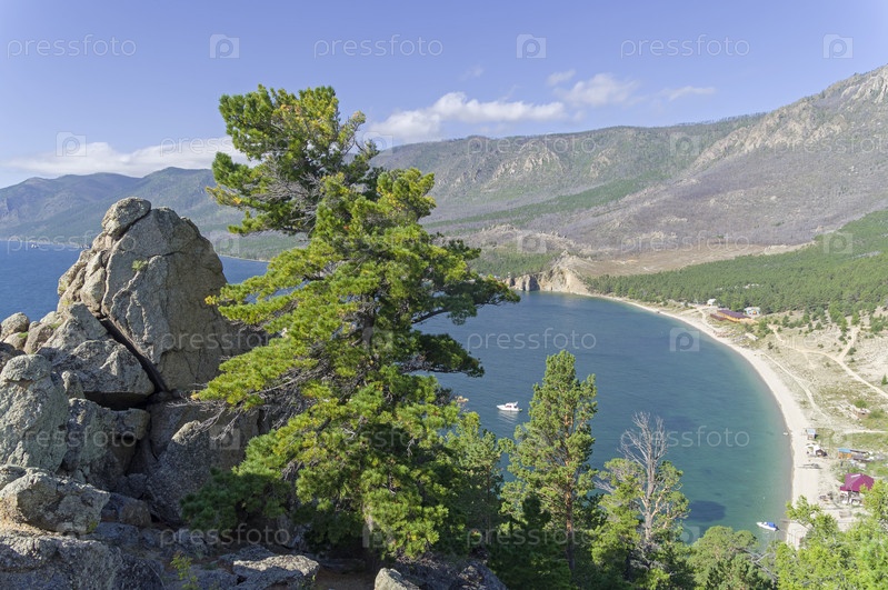Вид с Большого Колокольного мыса на бухту Песчаная. Большая Байкальская тропа. Озеро Байкал. Иркутская область, Россия. Август