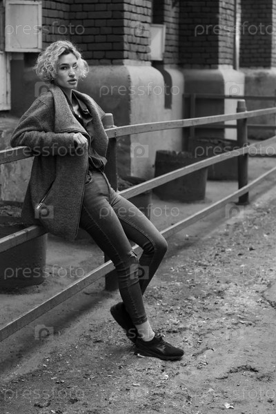 Молодая красивая женщина позирует в сером пальто на улице