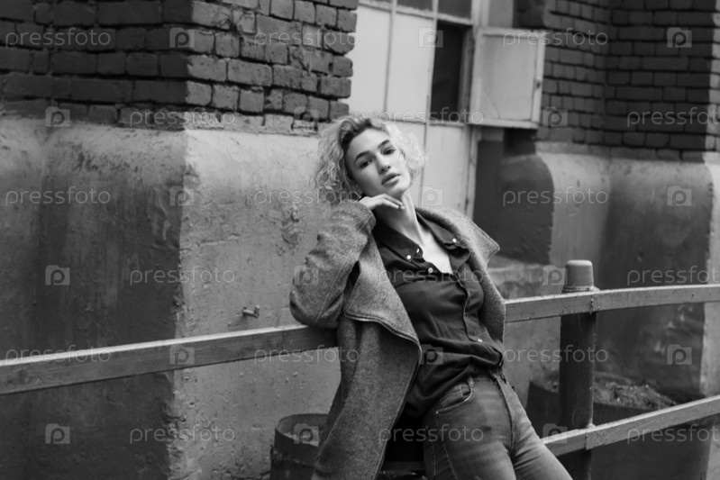 Молодая красивая женщина позирует в сером пальто на улице