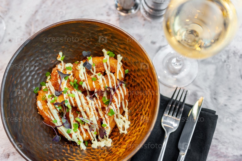 Кольца кальмара в панировке, обжаренные во фритюре с бокалом белого вина