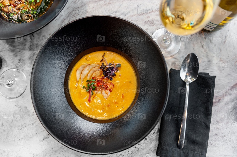 Тыквенный крем-суп с креветками на столе в ресторане с бокалом вина