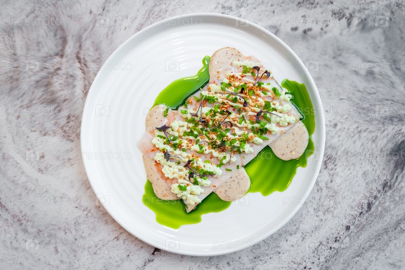 Тартар из креветок с кунжутным соусом и кремом васаби на белой тарелке