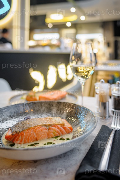 Филе лосося в сливочном соусе с зеленью на мраморном столе в ресторане