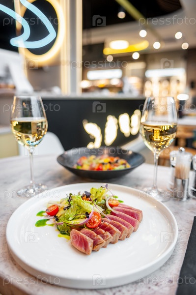 Салат из тунца татаки с салатом, помидорами черри и авокадо на мраморном столе