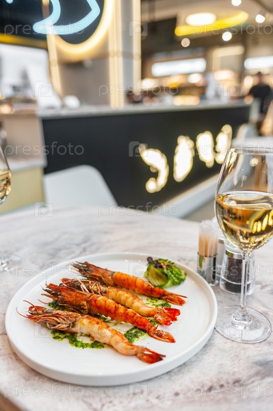 Лангустины со шпинатным соусом на белой тарелке с бокалом белого вина