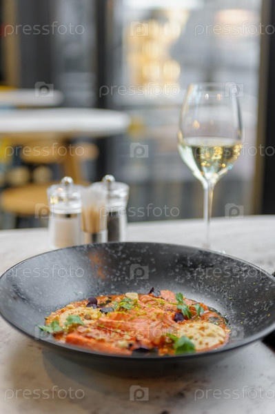 Татаки из лосося в соусе с арахисом и зеленью на мраморном столе в ресторане