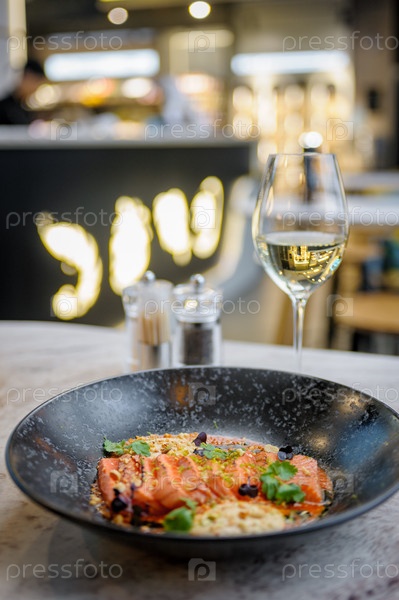 Татаки из лосося в соусе с арахисом и зеленью на мраморном столе в ресторане