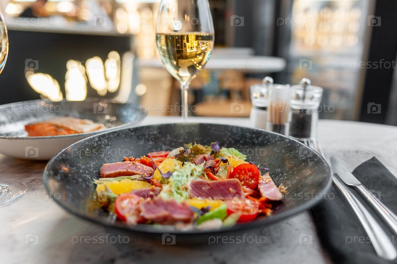 Салат из тунца татаки с салатом, помидорами и апельсином на мраморном столе