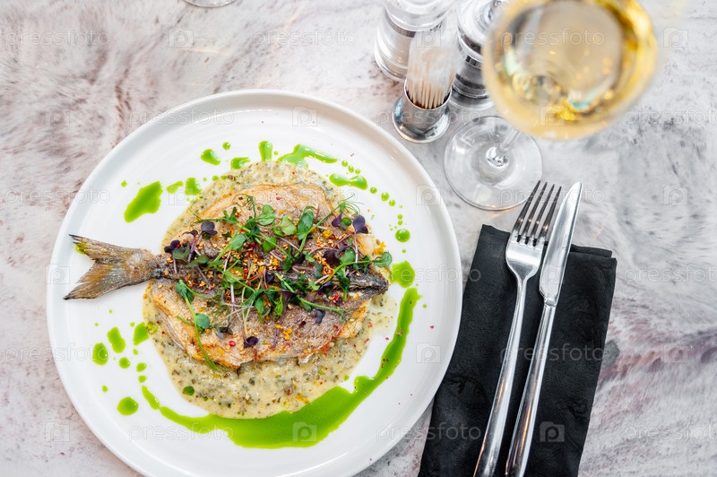 Сибас в сливочном соусе с прованскими травами и зеленым маслом на белой тарелке